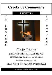 « All Events This event has passed. Free Concert – Chiz Rider July 8, 2022 @ 7:00 pm - 8:00 pm « Independence Day Supper & Testimony » All Welcome! Come be blessed! + Google Calendar+ Add to iCalendar Details Date: July 8, 2022 Time: 7:00 pm - 8:00 pm